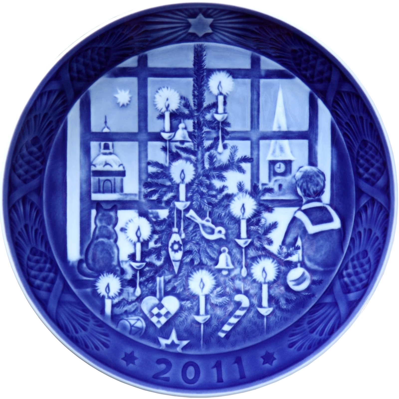 is the subject of the 2011 Royal Copenhagen Christmas Plate, featuring a young boy and a cat, sitting on either side of a large Christmas tree, and staring out the window on Christmas Eve, hoping to catch a glimpse of Santa and his sleigh. The Christmas Star can be see burning brightly in the night sky.