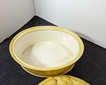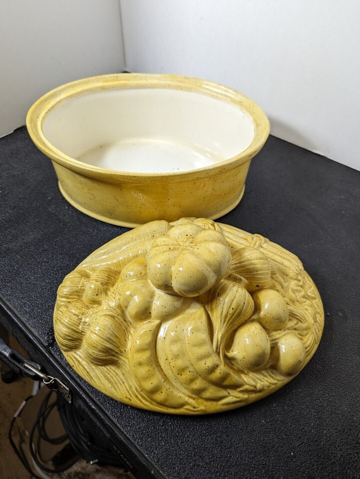 Tan handmade ceramic soup terrine with vegetable design on lid signed on the bottom by the artist