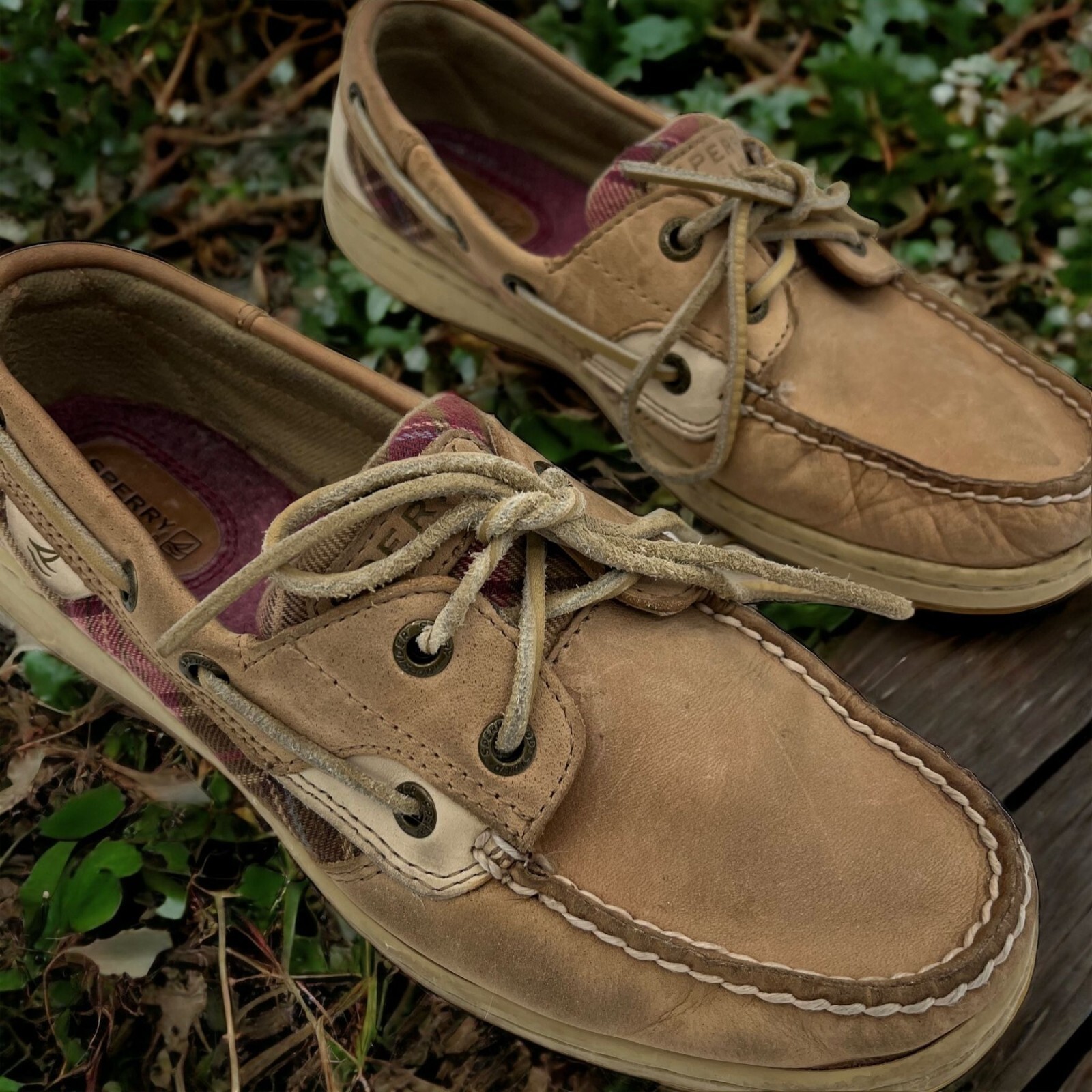 - sperry top sider womens angelfish boat shoes in tan with purple plaid size 7M