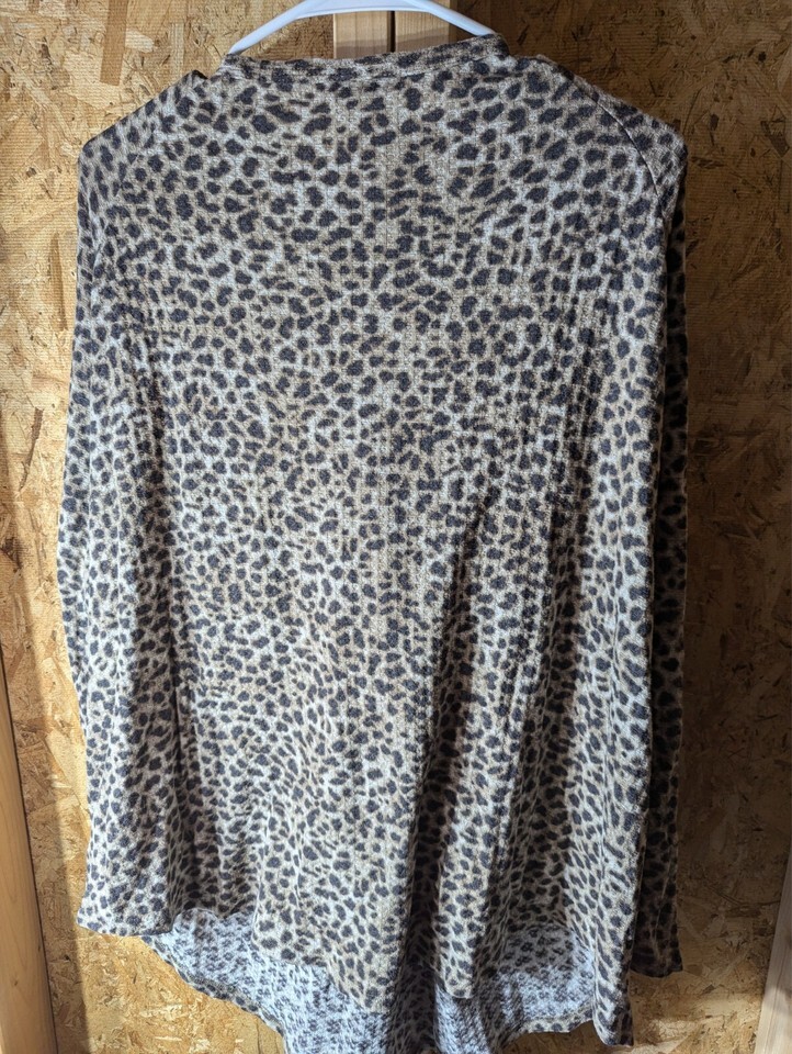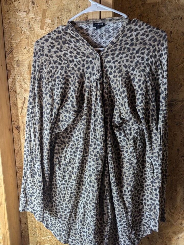 This Torrid long sleeve shirt is a must-have for any wardrobe. The leopard print pattern adds a touch of playfulness to the shirt, while the V-neckline and button closure provide a classic and sophisticated look. The shirt is made from a lightweight and stretchy polyester blend knit fabric, making it suitable for all seasons and perfect for travel and casual occasions.