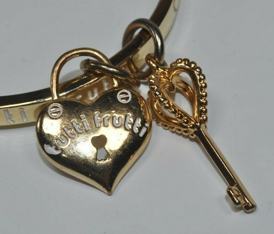 - tutti frutti Signed Gold Tone Bangle Bracelet w/ Heart and Key Charms