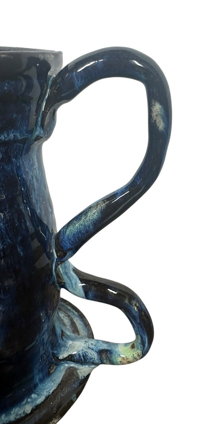 - Vtg Artisan Crafted Pottery Dark Blue Ceramic Double Handled Pitcher Rustic 6.5"